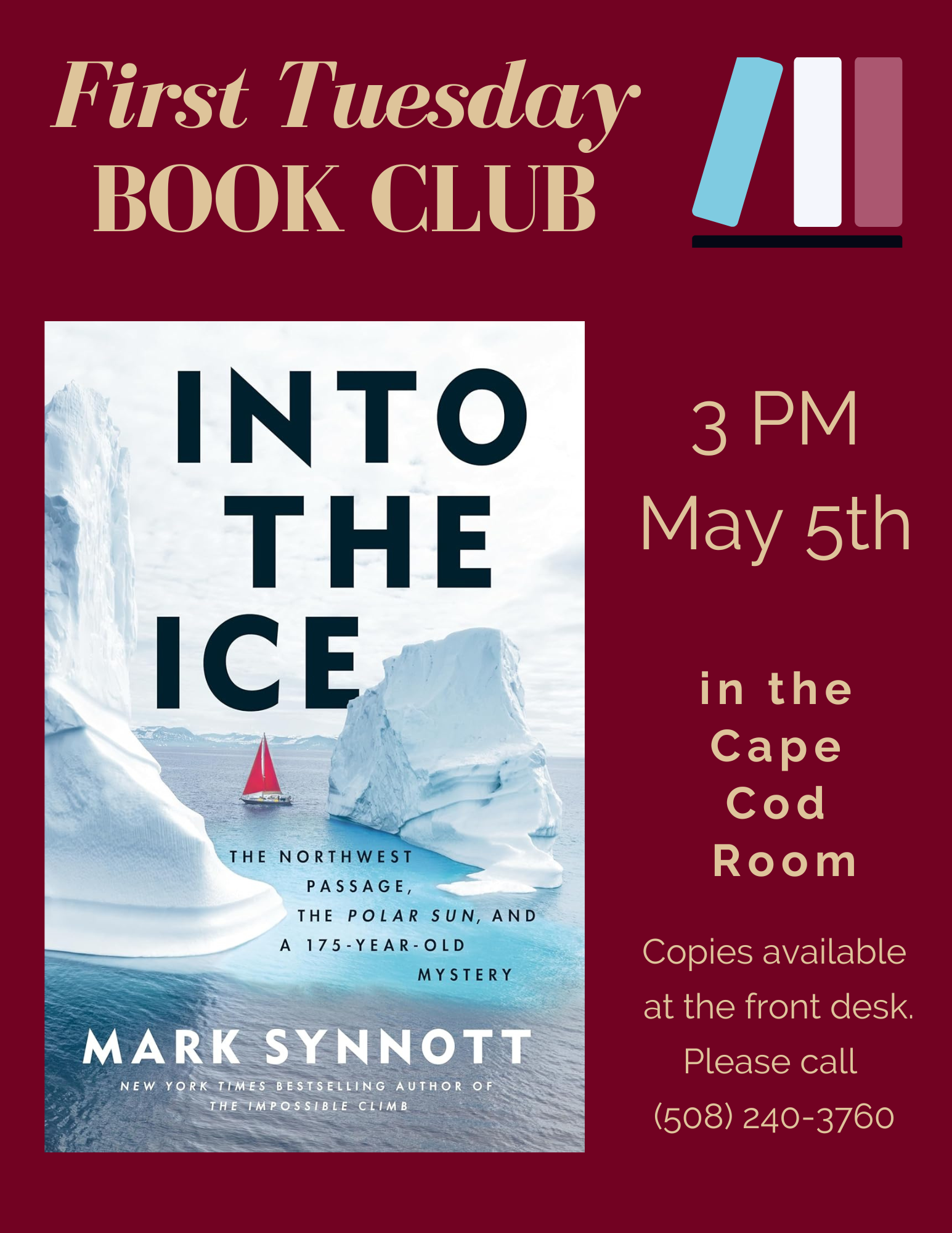 /Our next book club will take place on May 5th at 3 p.m. in the library’s Cape Cod Room. We’ll be discussing Into the Ice by Mark Synnott. Copies are available at the front desk.