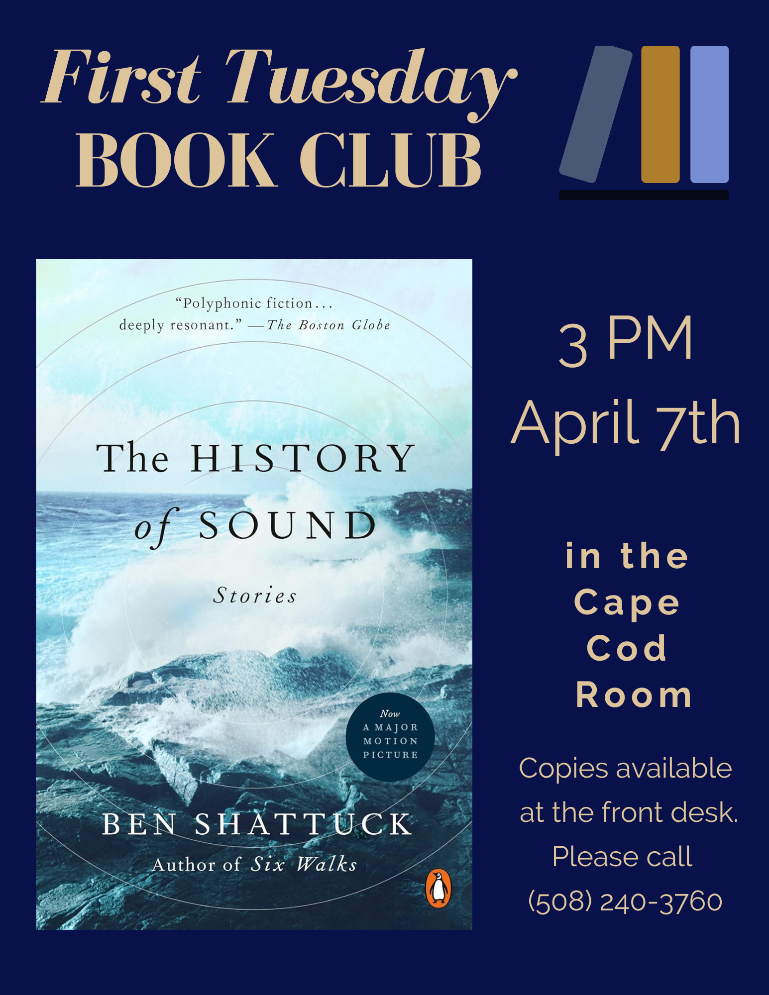 /Our next book club will take place on April 7th at 3 p.m. in the library’s Cape Cod Room. We’ll be discussing The History of Sound by Ben Shattuck. Copies are available at the front desk.