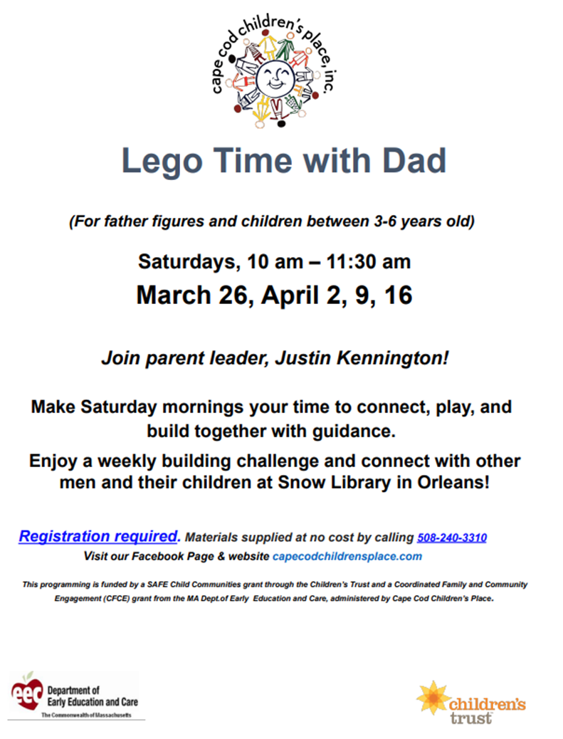 Father figures with children ages 3 to 6 are welcome to join parent leader Justin Kennington to connect, play and build together with guidance. Enjoy a weekly building challenge and connect with other men and their children. Offered by the Cape Cod Children's Place. Registration required. Materials supplied at no cost. Call (508) 240-3310 to sign up or for more information.